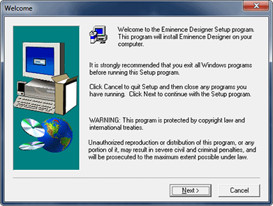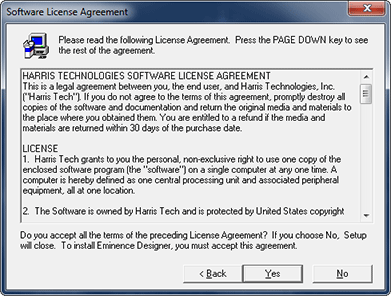 - The Software License Agreement will appear next (shown below). Please read it before proceeding. This is a legal document that you must agree to before you can proceed with the installation. If you do not, then click the "No" button to exit the setup program. We offer only single-user licenses for Eminence Designer. It allows you to install the program on more than one computer as long as it is used on only one computer at a time. It also allows more than one person to use the program as long as only one person uses it at a time. You can think of it as a book that only one person can read at a time. Eminence Designer should never be installed on a network. Nor should you ever make copies of the installation disc to give to other people. However, you can make a backup for yourself (recommended). Once you've read the license agreement and agree to abide by its terms, then click the "Yes" button to continue.