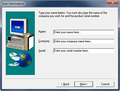- Next you must enter your name and the Eminence Designer serial number in the dialog shown below. If desired, you can also enter a company name. Please keep your name and the company name simple—do not use punctuation like quotation marks. The serial number is located on the back of the Eminence Designer CD case and should be mostly numbers—there are only two letters: the "D" in the middle and the "E" at the end. This means that all "0" are zeros and not the letter "o". The serial number is not case sensitive and you can use upper or lower case. Click on the "Next" button to continue.