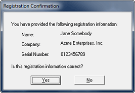 The Registration Confirmation dialog will appear (shown below) so you can double-check your information. If it is correct, click on the "Yes" button. Otherwise, click on the "No" button and the program will return to the previous dialog so you can re-enter your information and the serial number.