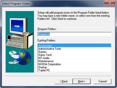 - The Select Program Folder dialog will appear next (shown below). This setting is less critical, but again, we recommend that you use the default setting. Click on the "Next" button to continue.