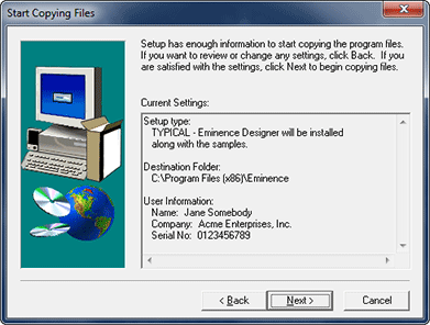 - The Setup Type dialog will appear next (shown below). We strongly recommend that Windows 7 and Windows Vista users do NOT change these settings. Use the default "Typical" installation and use the default Destination Folder (usually "C:\Program Files\Eminence" for 32-bit versions of Windows and "C:\Program Files (x86)\Eminence" for 64-bit versions of Windows). Eminence Designer may not function properly if you use a different Destination Folder. Click on the "Next" button to continue.