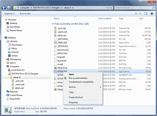 - With the installation CD-R disc in the computer, run the Windows Explorer (Windows key+E) and navigate to the "setup-d" folder on the CD-R (E-Designer). Right-click on the "setup.exe" file and select "Properties" from the popup menu as shown below: