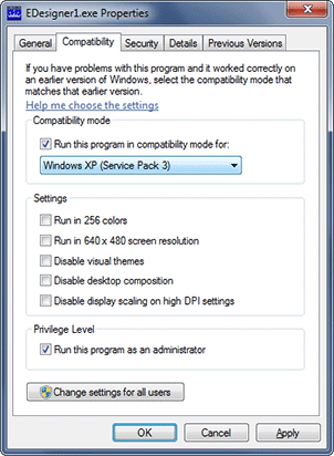 - Check "Run this program in compatibility mode for:" at the top of the dialog and choose "Windows XP (Service Pack 3)" for the mode.