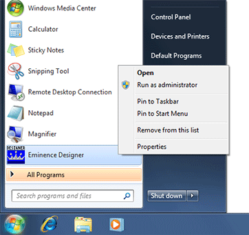 Or you can click on "All Programs" in the Windows Start menu, locate the "Eminence" folder and right-click on "Eminence Designer" there (shown below).