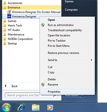 - Right-click on Eminence Designer and select the "Properties" command from the popup menu. There are three places where you can do this and you only need to do it at one of them. If you see a large Eminence Designer icon in the Windows Start menu (shown below), you can right-click on it there.