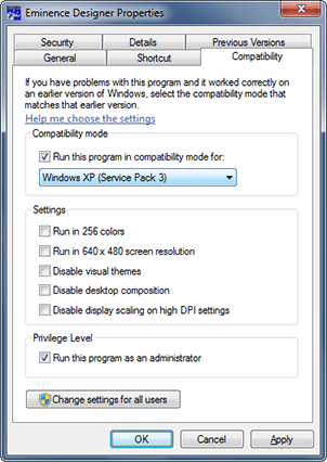 The following steps begin with the Eminence Designer 1 setup program on the installation CD-R and describe how to control its compatibility and permission settings of Windows 7 and Vista to help you circumvent these kinds of problems. Similar principles apply to Windows 8.x and to the Eminence Designer program, itself, and the maintenance updates available from our website.