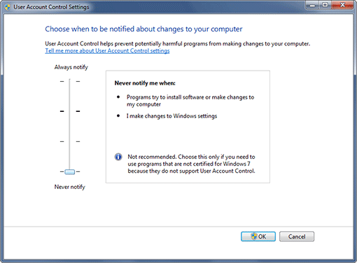 As we wrote at the top of this page, we have not been able to get Windows 8, 7 or Vista to exhibit problems with either compatibility or privilege in our lab and, even though it is rarely reported by our users, enough reports have surfaced to prompt this section. In most cases (but not all) the computers involved where not in the U.S. and were running international versions of Windows 8, 7 or Vista. The symptoms vary and include: