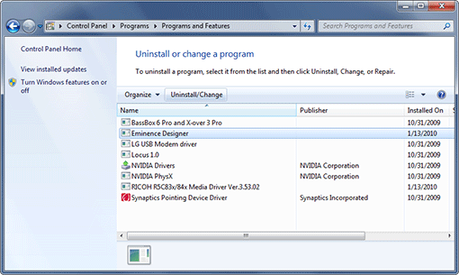 A list of the programs installed on your computer should appear as shown below. Select Eminence Designer from the list and click on the "Uninstall/Change" button at the top of the list.