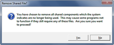 If a message similar to the one shown below appears, it indicates that a system file that was installed with Eminence Designer does not appear to be needed any more. Respond by clicking "Yes to All" so that all unneeded system files that were installed with the program are removed. Remember, you are about to reinstall the program and the system file will be reinstalled with it. Removing it here is a good idea to insure that dependent files are properly installed and linked during the next attempt to install the program.