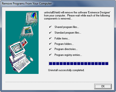 Finally, a Remove Programs From Your Computer dialog will appear to display the progress as Eminence Designer is removed from your computer. When it has finished, click on the "OK" button. You should now be ready to continue to Step 2 below.