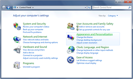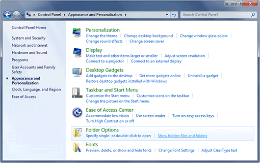 If, on the other hand, Eminence Designer does not appear in the Uninstall list (or the setup program was unable to finish during the previous attempt to install Eminence Designer), then you will need to manually check to see if the program and/or its folders were installed on your computer. If they were, then you should delete them. However, before this can be done, you must configure Windows to show its hidden system files and folders. To do this, launch the Windows Control Panel again from the Windows Start menu unless it is still open. Then click on "Appearance and Personalization" (highlighted below).