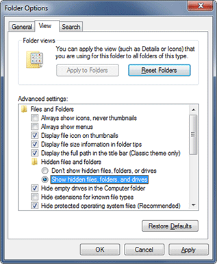 The Folder Options dialog will open (shown below). Turn on the "Show hidden files, folders, and drives" option. It might also be helpful to uncheck the "Hide extensions for known file types" option if it is checked. This will make it easier to differentiate files with identical names but different extensions. Then click on the "OK" button to accept the changes and close the dialog. You can also close the Windows Control Panel now.