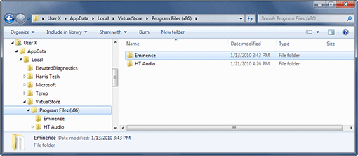 Next, you need to navigate to the folder of your Windows user account. We used "User X" below as a generic placeholder. If you gave your user account your name and your name is Jane, then look for a "Jane" folder. You'll probably see it above the "Computer" in the treeview on the left of the Windows Explorer. Once you find it, open it and navigate to "AppData\Local\VirtualStore\Program Files (x86)" as shown below. Delete the "Eminence" folder and all of its contents if you find it. Note: If you're using a 32-bit version of Windows 7 or Vista, the path will be "AppData\Local\VirtualStore\Program Files".