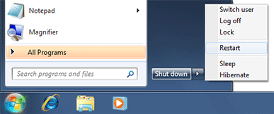 - Restart your computer. One way to do this is to select "Shut down > Restart" from the Windows Start menu (shown below).