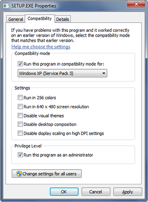 - Check "Run this program in compatibility mode for:" at the top of the dialog and choose "Windows XP (Service Pack 3)" for the mode.