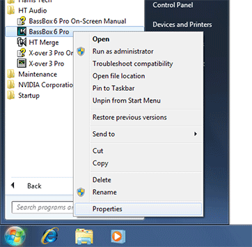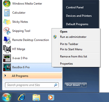 Or you can click on "All Programs" in the Windows Start menu, locate the "HT Audio" folder and right-click on "BassBox 6 Pro" there (shown below).