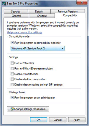 - Once you've selected the "Properties" command in the popup menu, the BassBox 6 Pro or BassBox 6.exe Properties dialog will open. The number of tabs it contains will vary depending on which of the three locations described above that you chose, but they will all have the "Compatibility" tab as shown in the examples below. Select it.