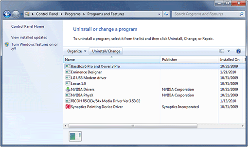 A list of the programs installed on your computer should appear as shown below. Select BassBox 6 Pro and X•over 3 Pro from the list and click on the "Uninstall/Change" button at the top of the list. Note: If only one program was installed, then select it (BassBox 6 Pro, BassBox 6 Lite or X•over 3 Pro).