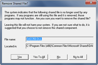 If a message similar to the one shown below appears, it indicates that a system file that was installed with BassBox Pro and X•over Pro does not appear to be needed any more. Respond by clicking "Yes to All" so that all unneeded system files that were installed with the programs are removed. Remember, you are about to reinstall the programs and the system file will be reinstalled with them. Removing it here is a good idea to insure that dependent files are properly installed and linked during the next attempt to install the program.