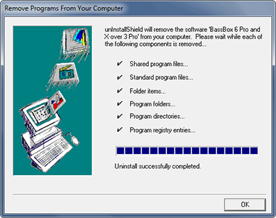 Finally, a Remove Programs From Your Computer dialog will appear to display the progress as BassBox Pro and X•over Pro are removed from your computer. When it has finished, click on the "OK" button. You should now be ready to continue to Step 2 below.