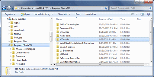 Next, launch the Windows Explorer (Windows key+E) and navigate to the "Local Disk (C:)" drive of your computer. This is normally the drive where Windows is installed. If it is not, then navigate to the drive where Windows is installed. Then search for an "HT Audio" folder inside either the "c:\Program Files" folder (32-bit) or the "c:\Program Files (x86)" folder (64-bit). The example shown below uses the 64-bit version of Windows 7 so the "Program Files (x86)" folder was selected. Delete the "HT Audio" folder and all of its contents if you find it.