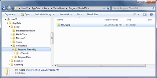 Next, you need to navigate to the folder of your Windows user account. We used "User X" below as a generic placeholder. If you gave your user account your name and your name is Jane, then look for a "Jane" folder. You'll probably see it above the "Computer" in the treeview on the left of the Windows Explorer. Once you find it, open it and navigate to "AppData\Local\VirtualStore\Program Files (x86)" as shown below. Delete the "HT Audio" folder and all of its contents if you find it. Note: If you're using a 32-bit version of Windows 8, 7 or Vista, the path will be "AppData\Local\VirtualStore\Program Files".