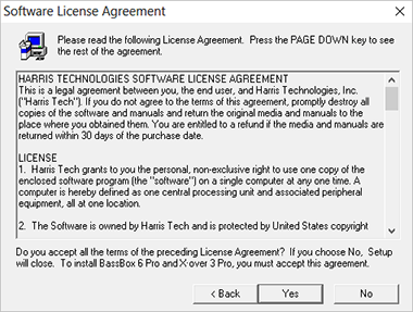 - The Software License Agreement will appear next as shown below. Please read it before proceeding. This is a legal document that you must agree to before you can proceed with the installation. If you do not, then click the "No" button to exit the setup program. We offer only single-user licenses for our software. It allows you to install the programs on more than one computer as long as they are used on only one computer at a time. It also allows more than one person to use the programs as long as only one person uses them at a time. You can think of them as a book that only one person can read at a time. Our software should never be installed on a network. Nor should you ever make copies of the installation disc to give to other people. However, you can make a backup for yourself (recommended). Once you've read the license agreement and agree to abide by its terms, then click the "Yes" button to continue.