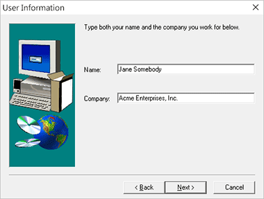 Enter your name and, if desired, company name in the input boxes of the User Information dialog shown below. Please keep the names simple—do not use punctuation like quotation marks. Click on the "Next" button to continue.