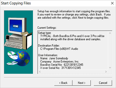 - The Setup Type dialog will appear next as shown below. We strongly recommend that you do NOT change these settings. Use the default "Typical" installation and use the default Destination Folder (usually "C:\Program Files\HT Audio" for 32-bit versions of Windows and "C:\Program Files (x86)\HT Audio" for 64-bit versions of Windows). BassBox Pro, BassBox Lite and X•over Pro may not function properly if you use a different Destination Folder. Click on the "Next" button to continue.