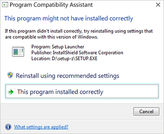 - Finally, a Program Compatibility Assistant dialog may appear and, if it does, its timing may vary. It may appear soon after the installation has completed or it may appear the first time that you launch one of the programs. It will want you to confirm that the programs were installed correctly. Unfortunately, its message may appear cryptic like the one shown below: